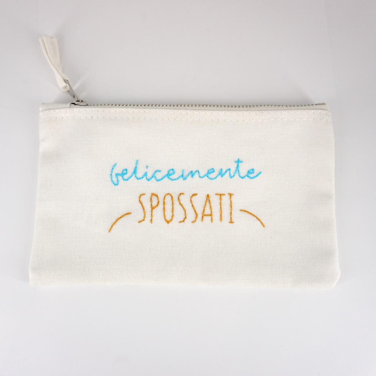 Un iconico ricamo impreziosisce questa pratica bustina in cotone bianco. Un divertente promemoria da portare sempre con sé o per un regalo decisamente unico.