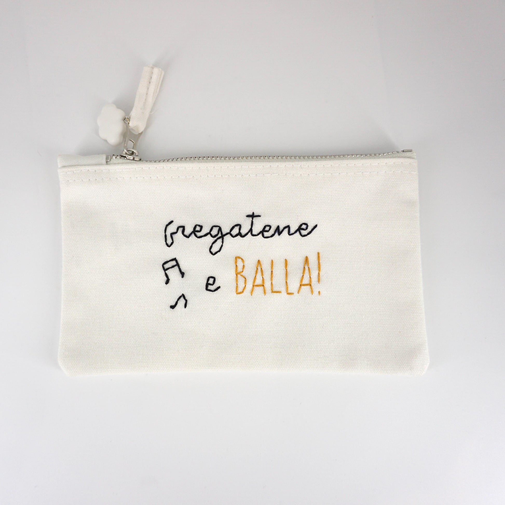 Un iconico ricamo impreziosisce questa pratica bustina in cotone bianco. Un divertente promemoria da portare sempre con sé o per un regalo decisamente unico.