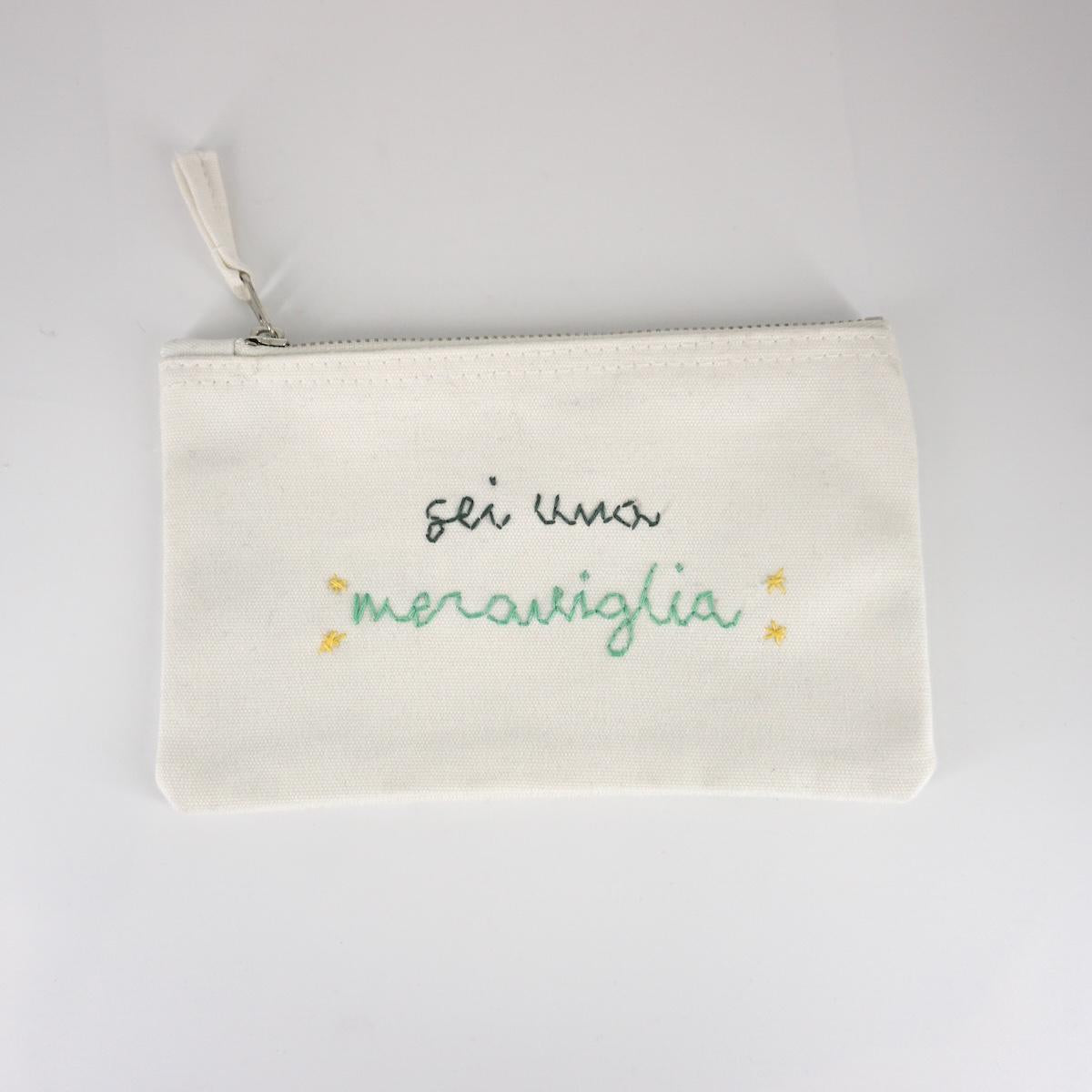 Un iconico ricamo impreziosisce questa pratica bustina in cotone bianco. Un divertente promemoria da portare sempre con sé o per un regalo decisamente unico.