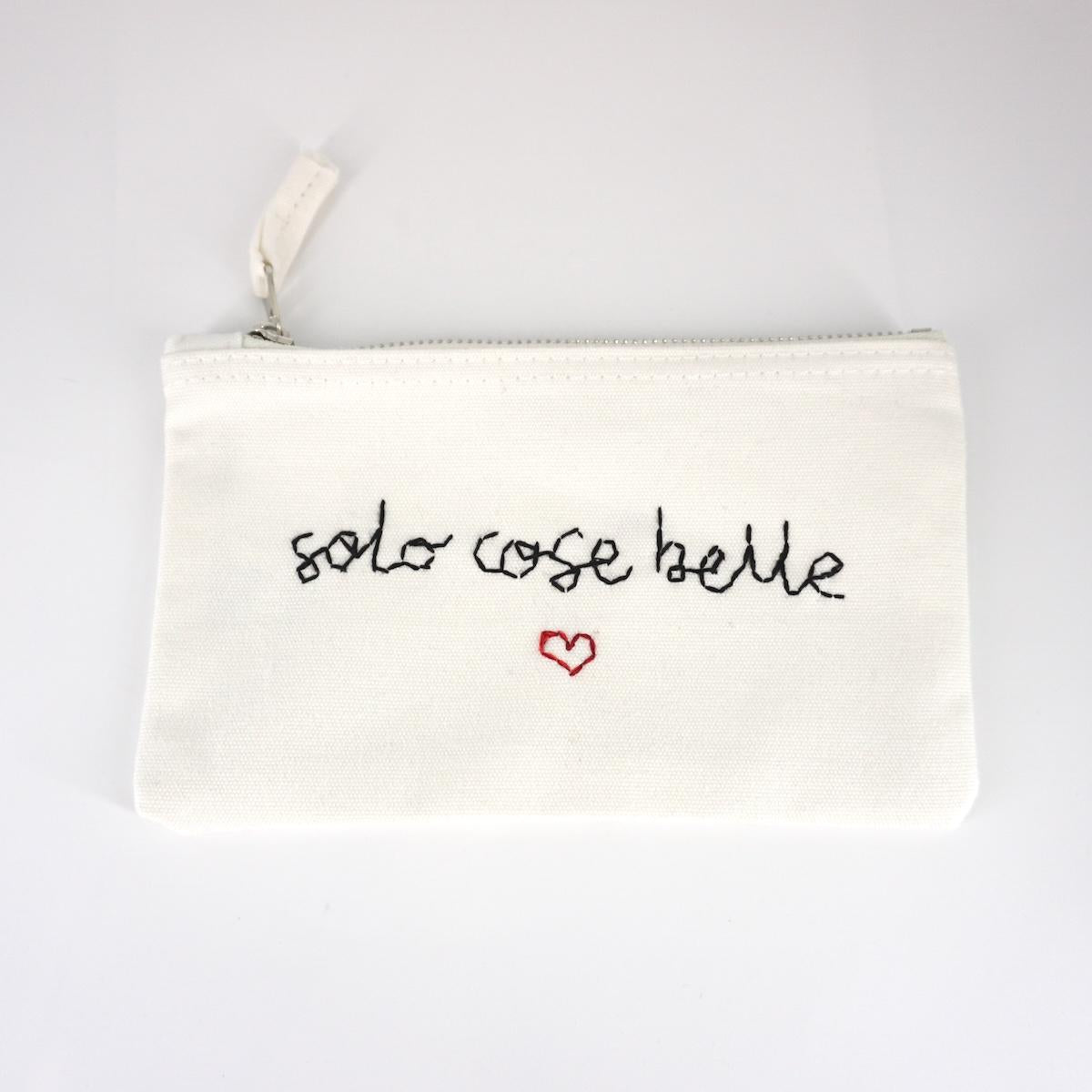 Un iconico ricamo impreziosisce questa pratica bustina in cotone bianco. Un divertente promemoria da portare sempre con sé o per un regalo decisamente unico.