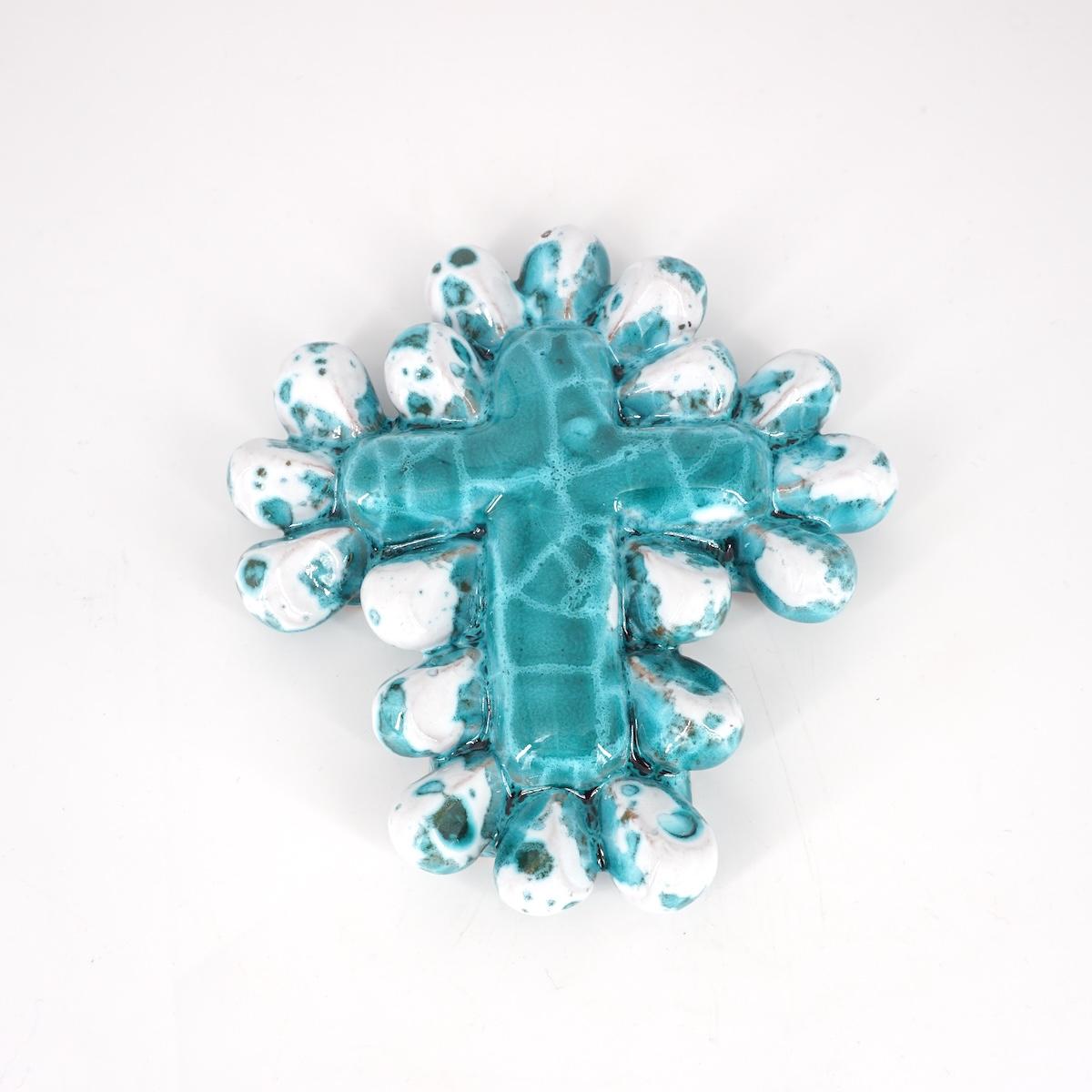 Questa croce fatta a mano in ceramica è un'opera unica, realizzata con cura e attenzione ai dettagli. Ogni pezzo è modellato e decorato artigianalmente, conferendo alla croce un aspetto caldo e personale. Le sue linee eleganti e il design raffinato la rendono un oggetto di grande valore simbolico e spirituale, ideale come elemento decorativo o come regalo speciale per occasioni significative. La ceramica, con la sua finitura liscia e i colori delicati, aggiunge un tocco di bellezza e serenità.