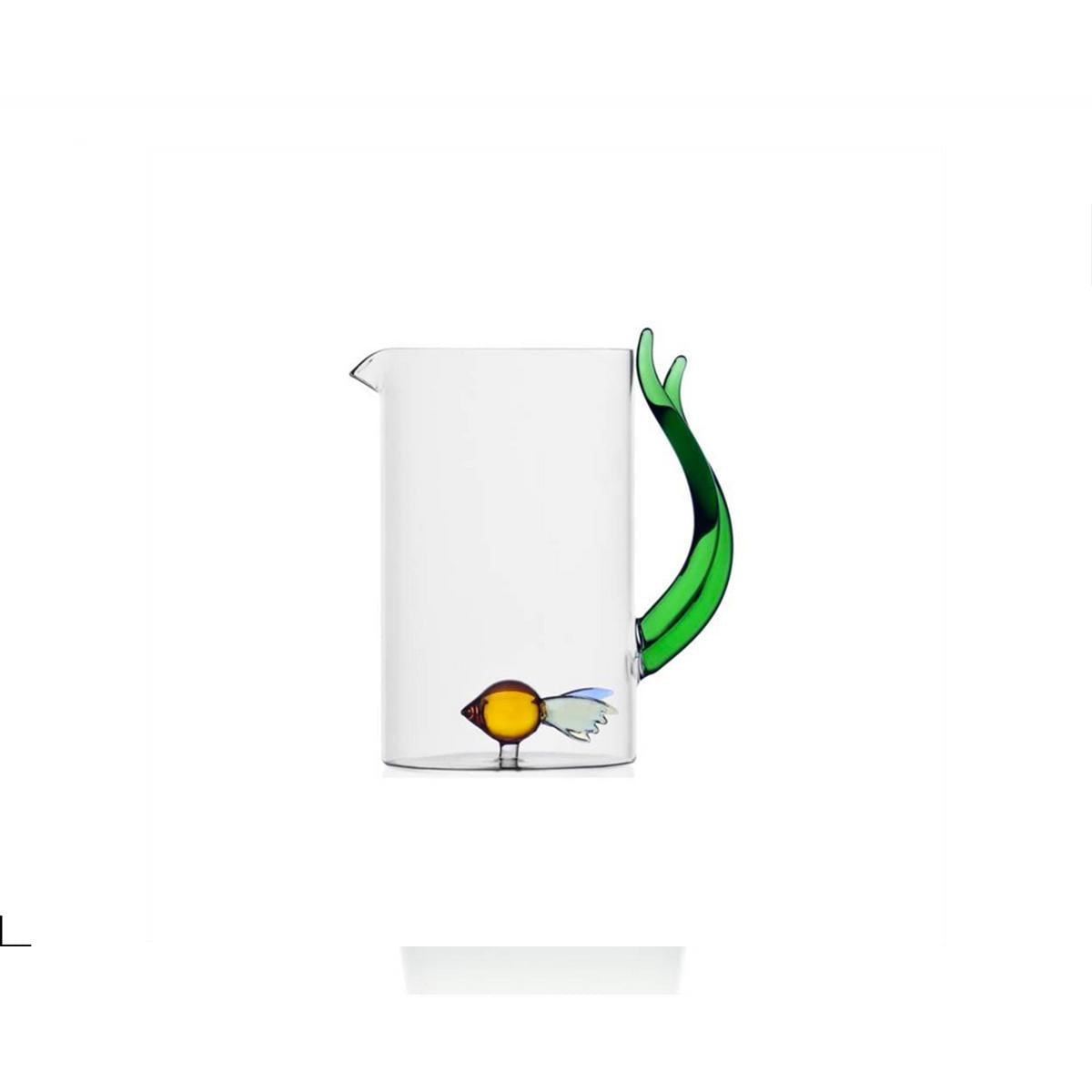 Per portare in tavola un tocco simpatico e colorato senza rinunciare ad un design elegante e ricercato. Ciò che rende unica questa brocca è proprio il manico a forma di alga che restituisce un'originale illusione ottica. Fatto a mano e modellato a lume.