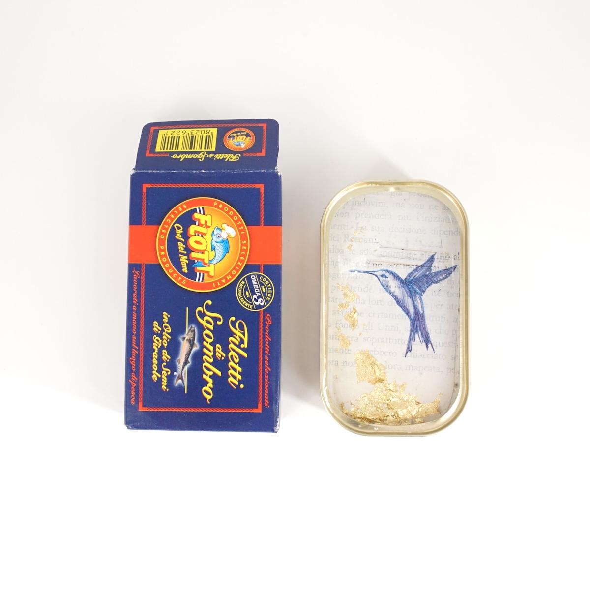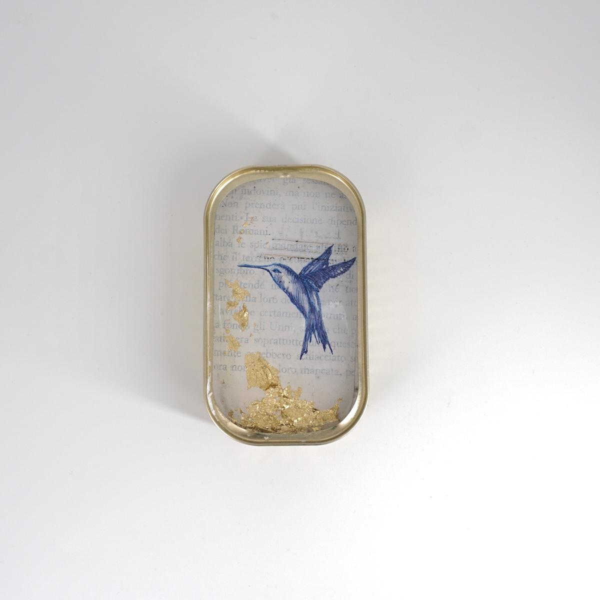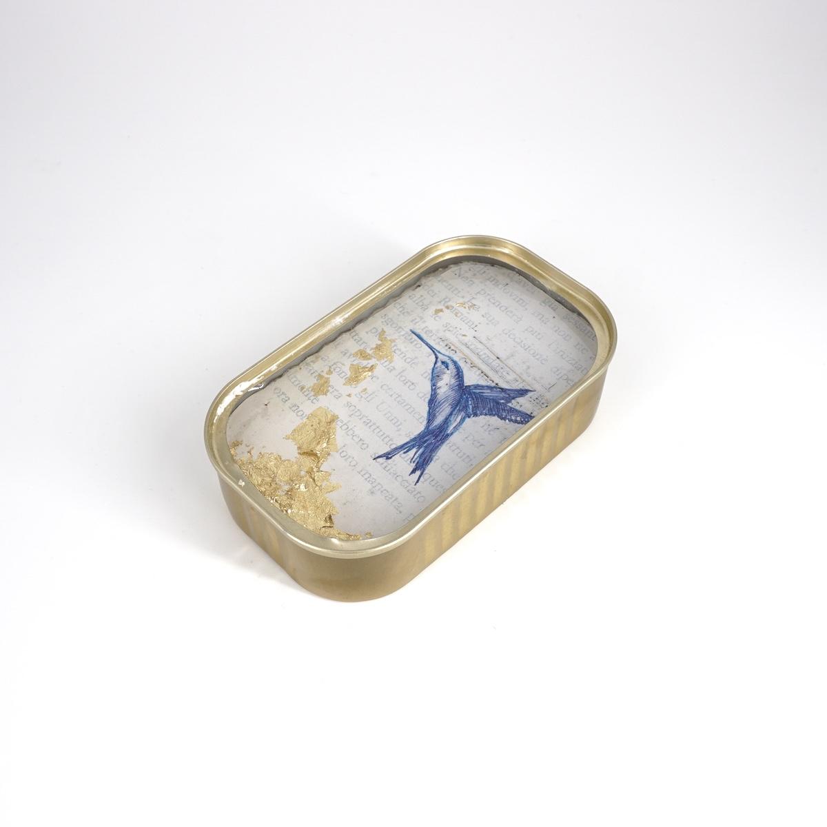 Materiale: scatoletta in latta, gesso, carta da parati o carta acquerellata, inchiostro, acrilico, foglia oro, resina epossidica