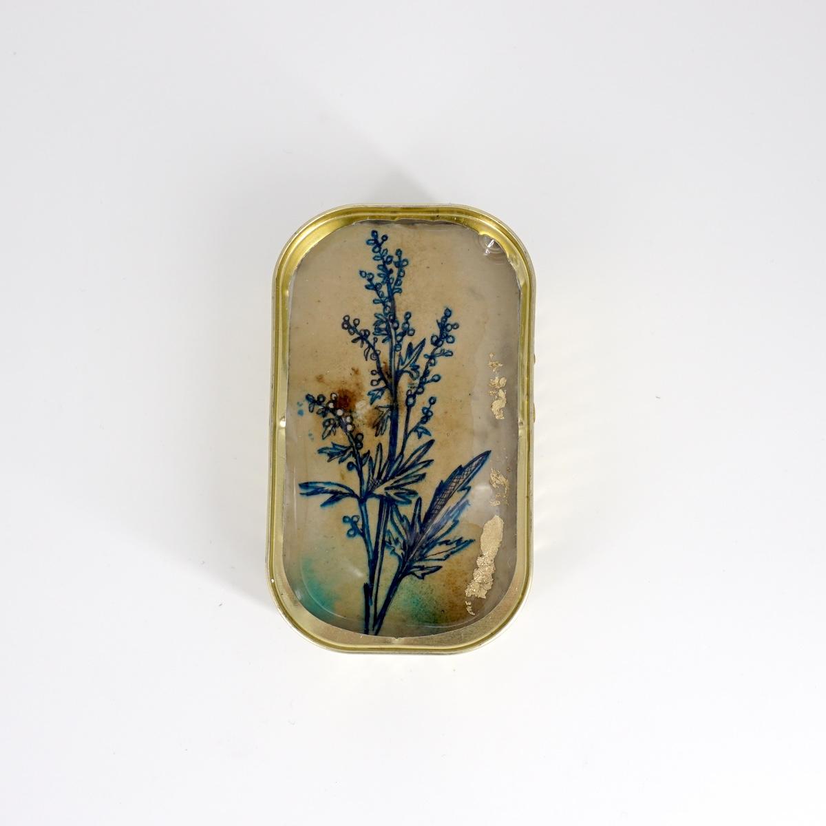 Materiale: scatoletta in latta, gesso, carta da parati o carta acquerellata, inchiostro, acrilico, foglia oro, resina epossidica