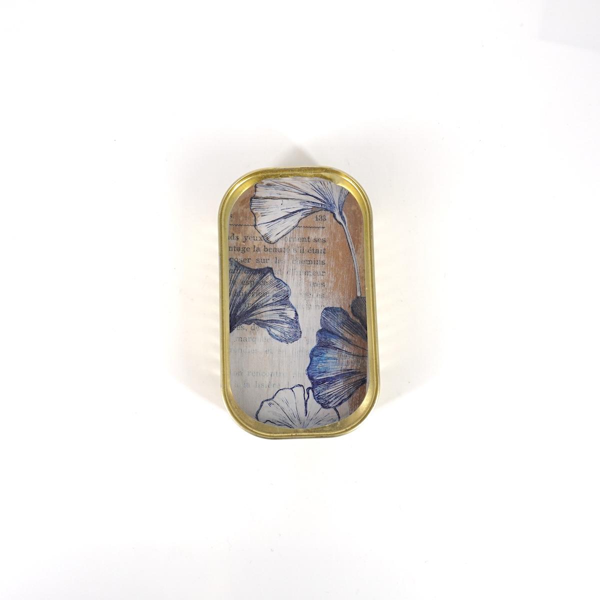 Materiale: scatoletta in latta, gesso, carta da parati o carta acquerellata, inchiostro, acrilico, foglia oro, resina epossidica