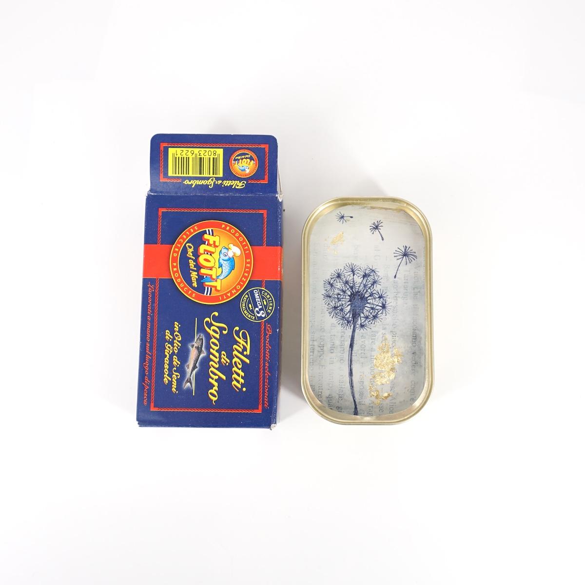 Materiale: scatoletta in latta, gesso, carta da parati o carta acquerellata, inchiostro, acrilico, foglia oro, resina epossidica