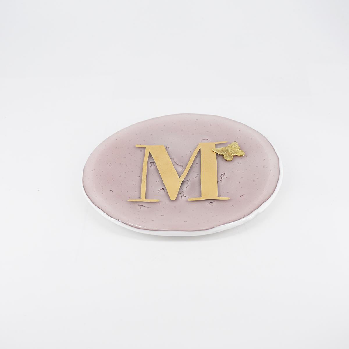Eleganza e personalità in un piattino di vetro di Murano. Con l'iniziale in oro e l'applique in ottone, questi piattini sono un vero e proprio gioiello artigianale.